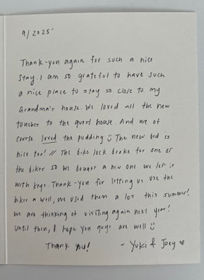 Thank you again for such a nice stay. I am so grateful to have such a nice place to stay so close to my grandma’s house. We loved all the new touches to the guest house. And we of course loved the pudding. The new old is nice too! The bike lock broke for one of the bikes so we bought a new one. We left it with keys. Thank you for letting us use the bikes as well. We used them a lot this summer!